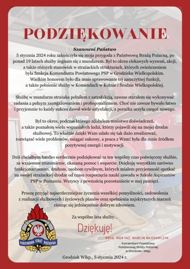 5 stycznia 2024 roku bryg. Marcin Włodarczyk zakończył służbę w Państwowej Straży Pożarnej, po blisko pięciu latach służby na stanowisku komendanta Państwowej Straży Pożarnej w Grodzisku Wielkopolskim.